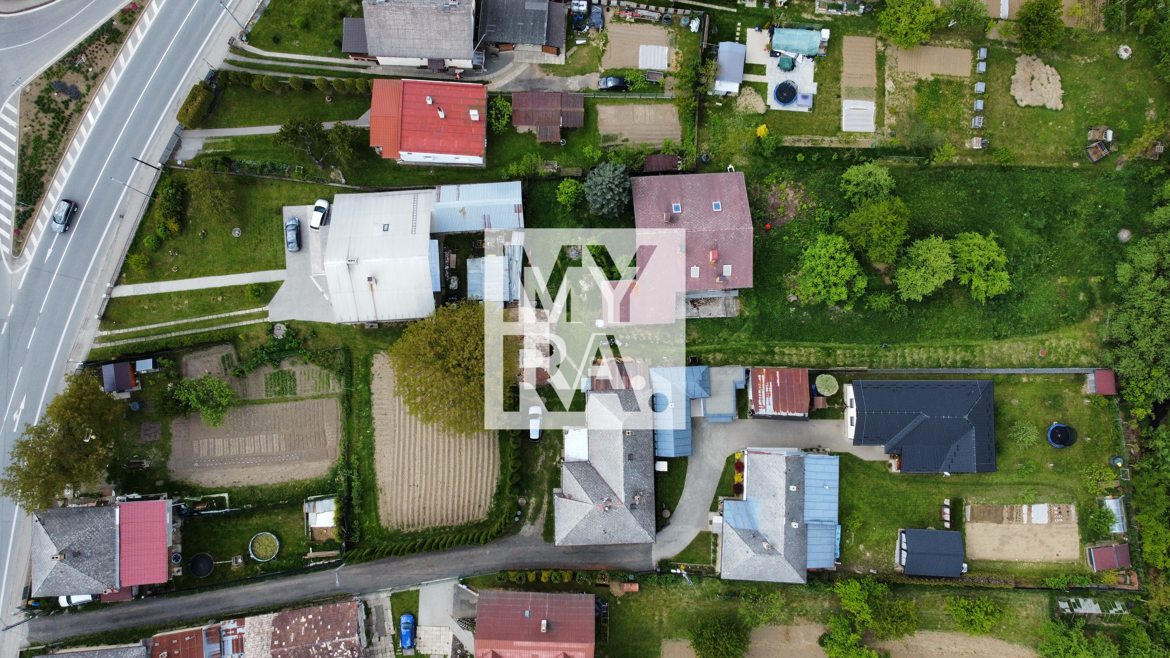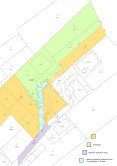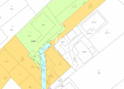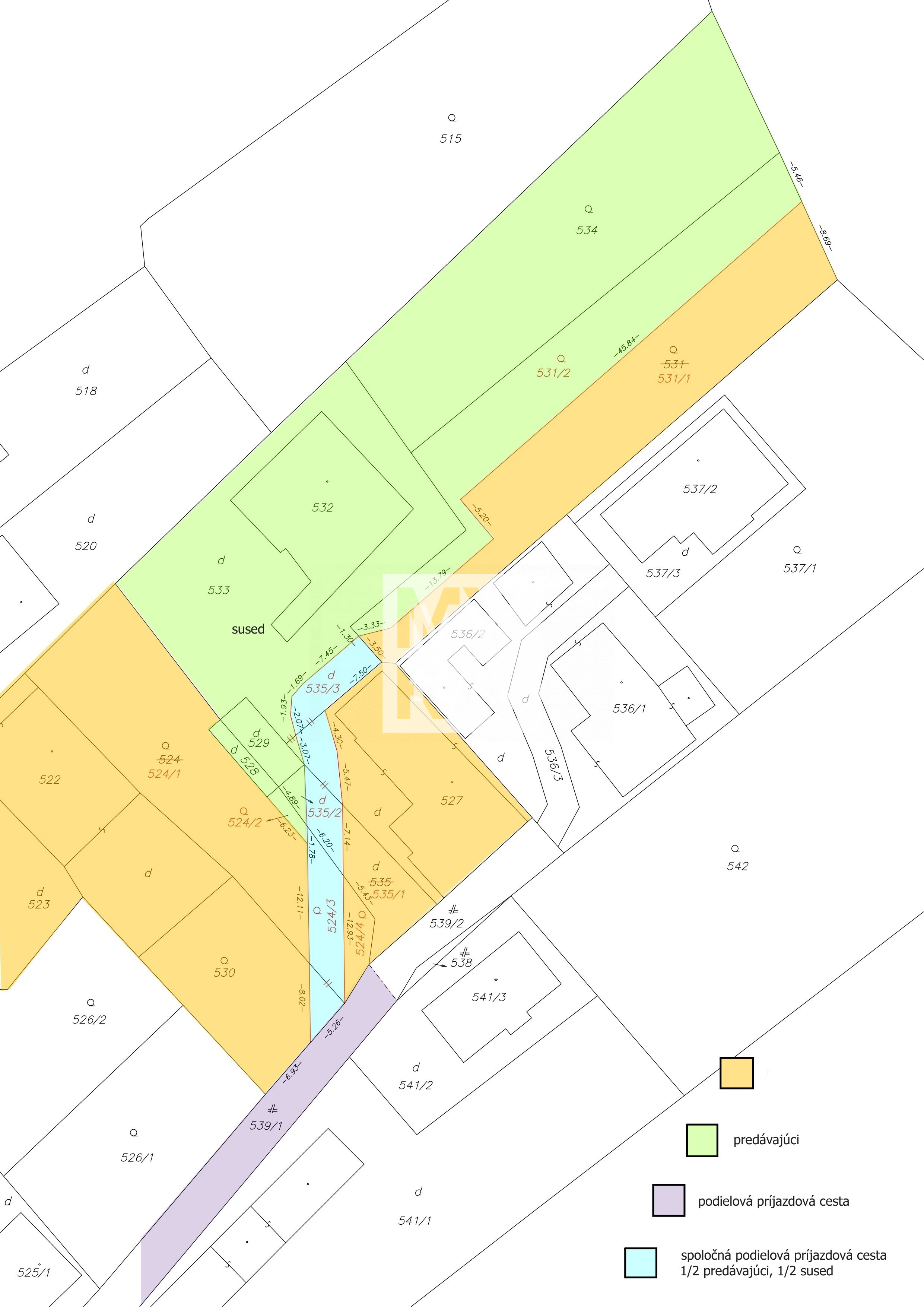 Zakreslená/zameraná nová podielová príjazdová cesta (viď nový geometrický plán - farebne odlíšený v galérií) v podielovom spoluvlastníctve predávajúcich/suseda v podiele1/2 a 1/2 o šírke 3,50 m;