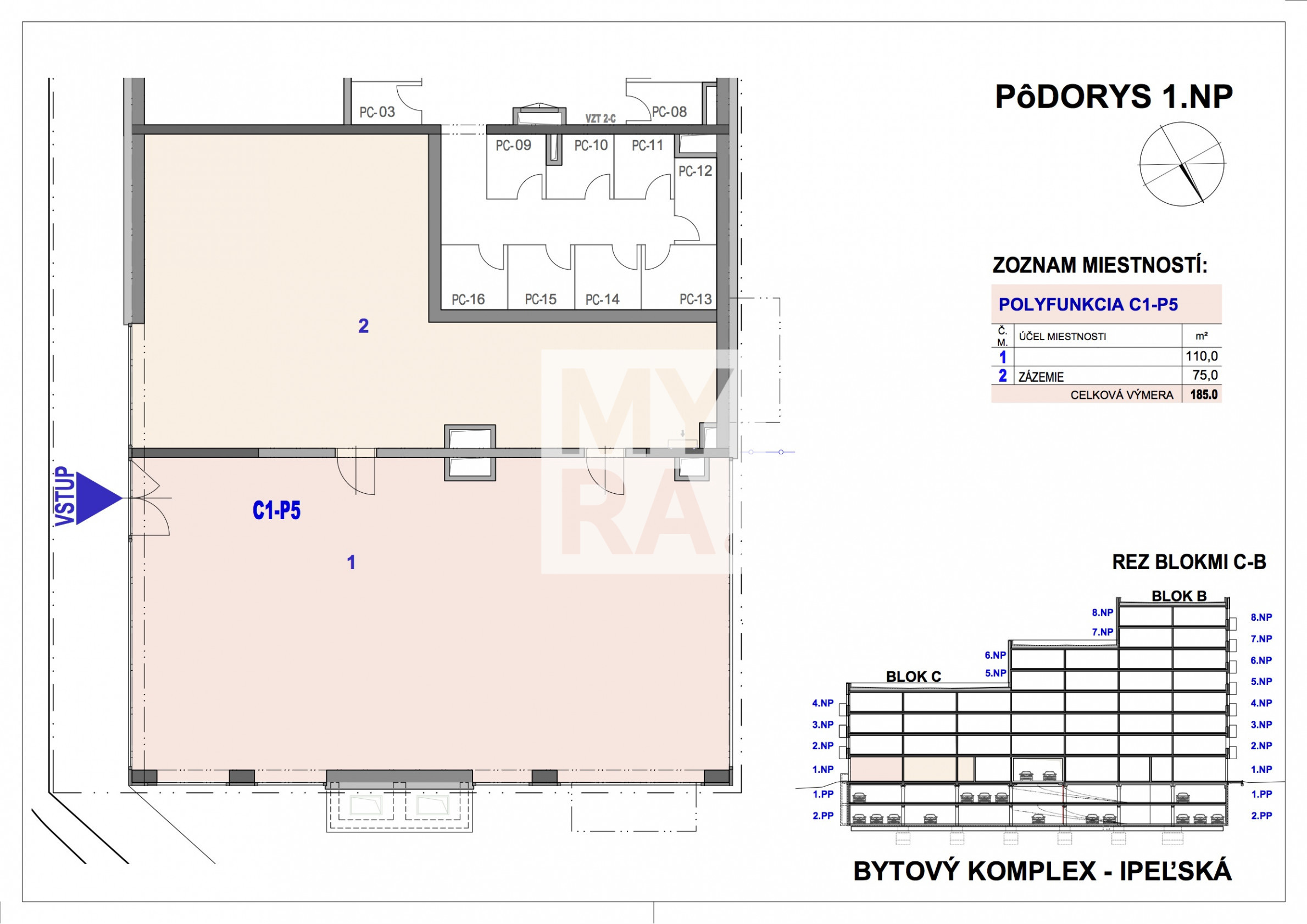 MYRA. Košice a realitný maklér Roman Magdolen Vám ponúkajú samostatný obchodný priestor C1-P5 v pripravovanom Bytovom komplexe Ipeľská. Ide o holopriestor na 1. NP o celkovej výmere 185 m2. Obchodný priestor je stavebne rozdelený na dve miestnosti: na polyfukciu o výmere 110 m2 a zázemie o výmere 75 m2.