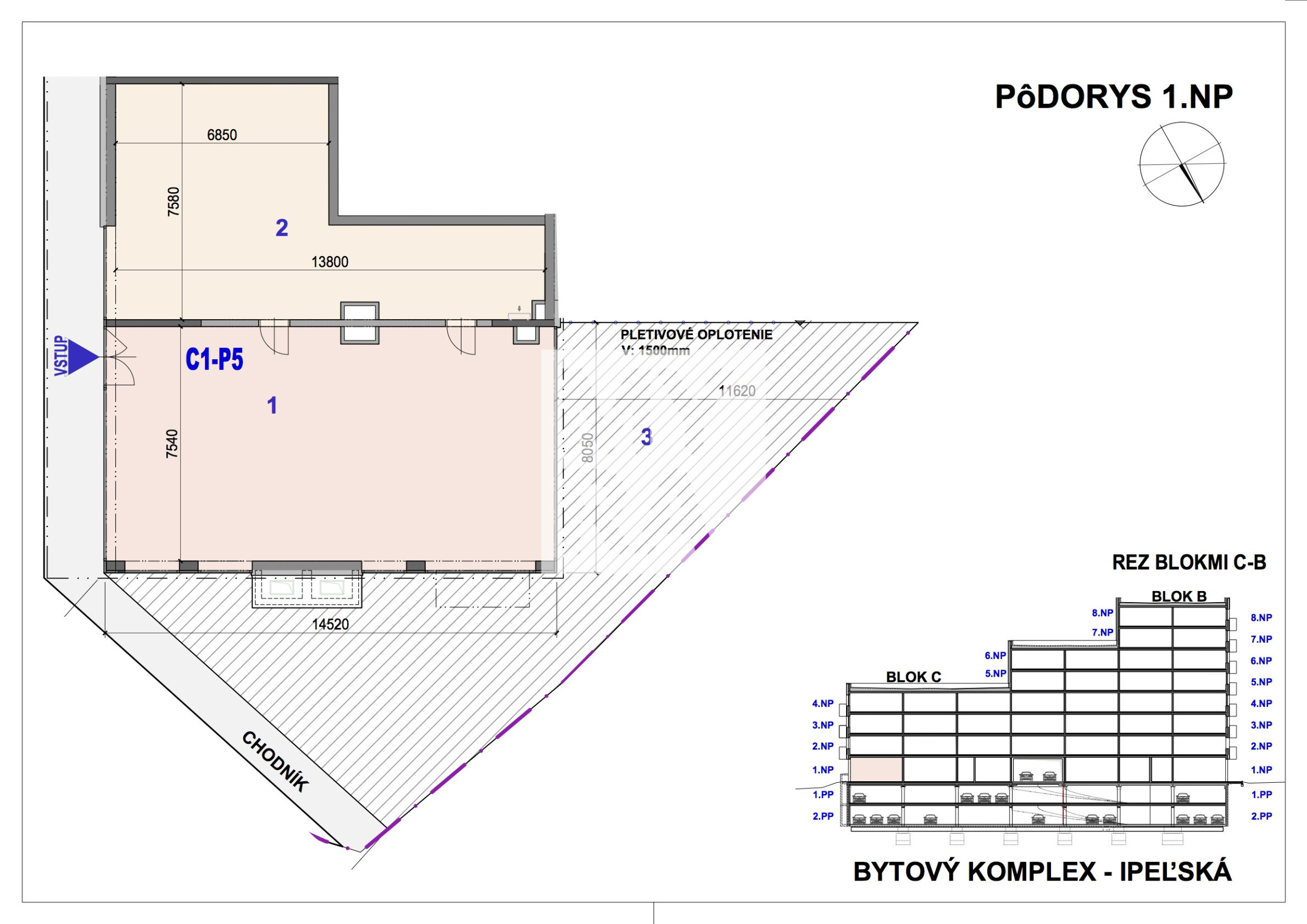 Obchodný priestor C1-P5 má vstup orientovaný na vnútornú komunikáciu a situovaný je v smere východ–západ. Cena za m2 je 3.000 eur bez DPH. Celková cena je 555.000 eur bez DPH.